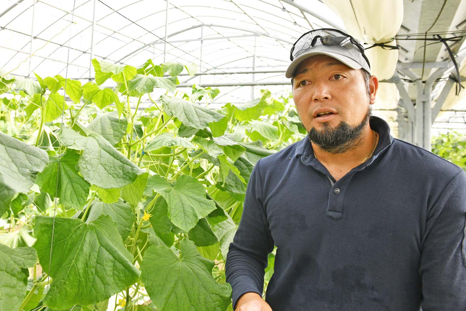 山城豪(やましろごう)さんは、糸満市に5カ所の圃場(ほじょう/農作物を栽培する土地)を持ち、従業員(特定技能外国人)3名を抱えるきゅうり農家です。夏場には1日で5cmほども大きくなるというきゅうりは、毎日朝晩2回の収穫が必要な時期もある野菜。早朝からの水・肥料やり、温度・湿度をコントロールするためのハウスの開閉、実を大きく、均一に成長させるために余分な葉や芽を摘む作業など、日々の仕事は目白押しです。