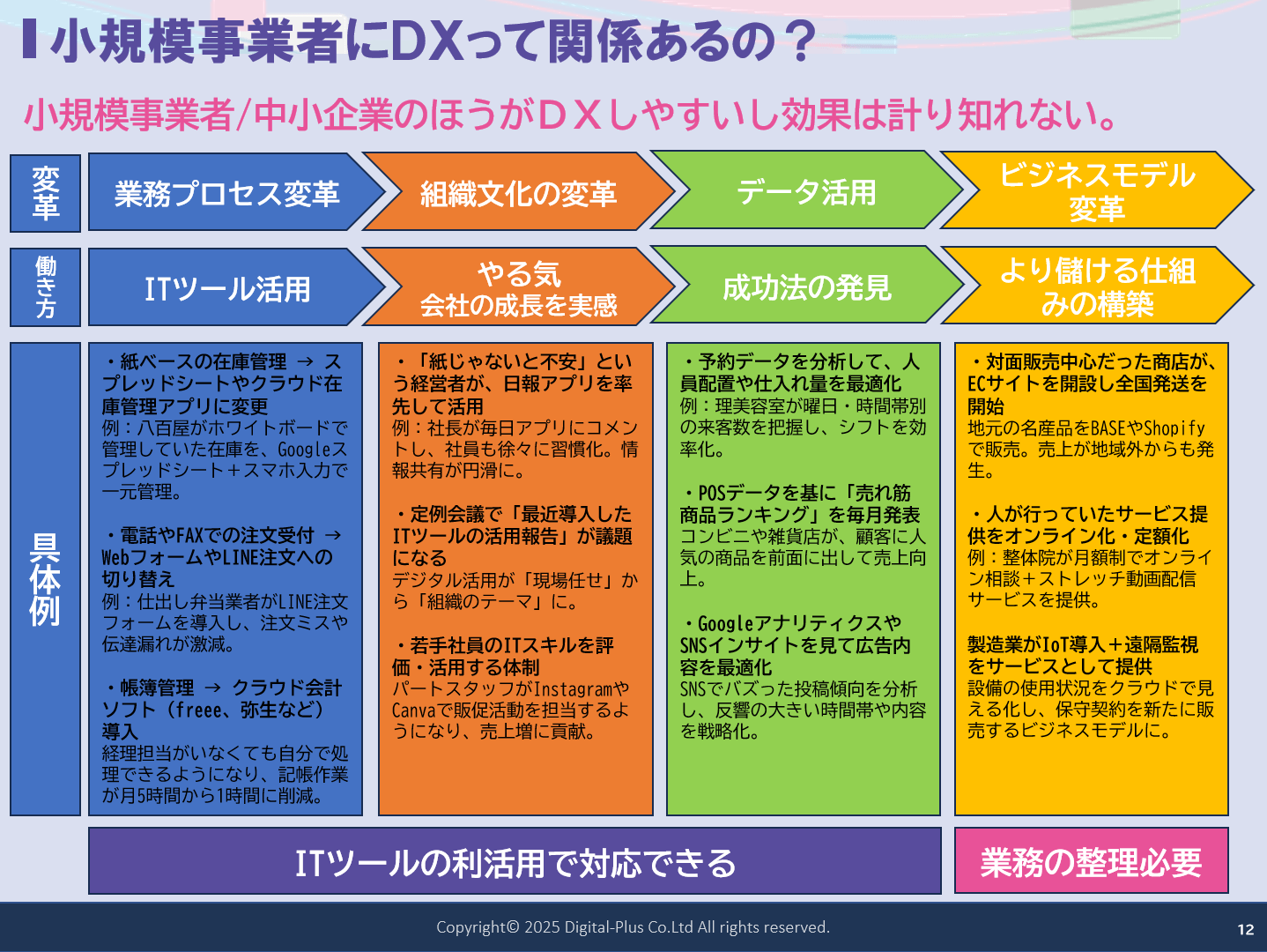 大企業が進めるものと思われがちなDXですが、組織がコンパクトな中小企業の方が取り組みやすく、その効果は非常に大きなものになるということです。スライドでは、変革のプロセスや社員の働き方が具体例とともに掲載されています。